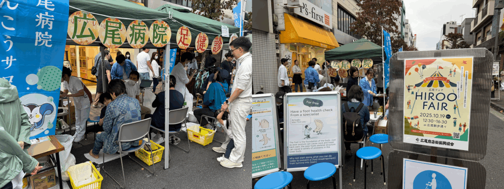 2025年10月19日(日)、東京都渋谷区で開催された「広尾商店街フェア」において、都立広尾病院主催のもと来場者を対象に足健診を実施しました。